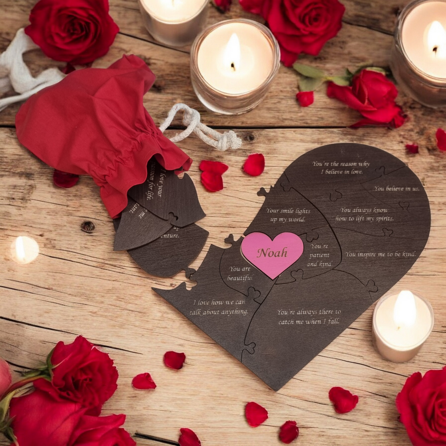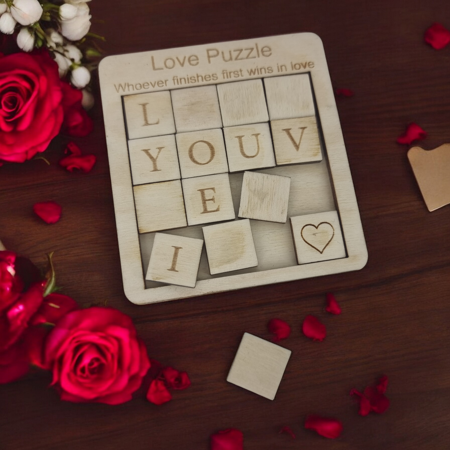 The puzzle is designed to be played with your partner – slide and rearrange the wooden tiles to reveal the heartfelt message: "I LOVE YOU." But there’s a twist – whoever completes the puzzle first wins!