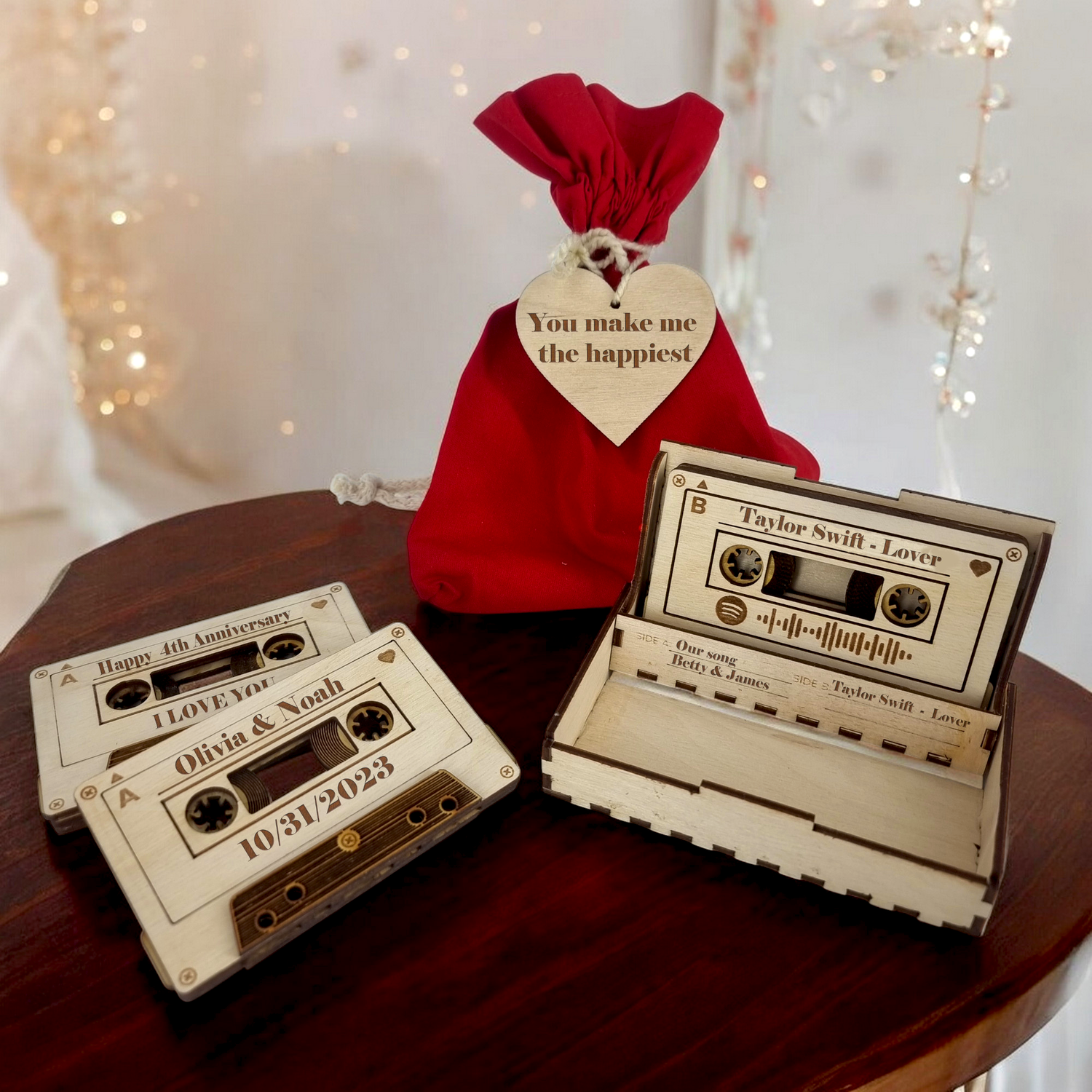 Custom-made with your chosen names, dates, and playlist, this unique gift combines retro charm with modern technology.
