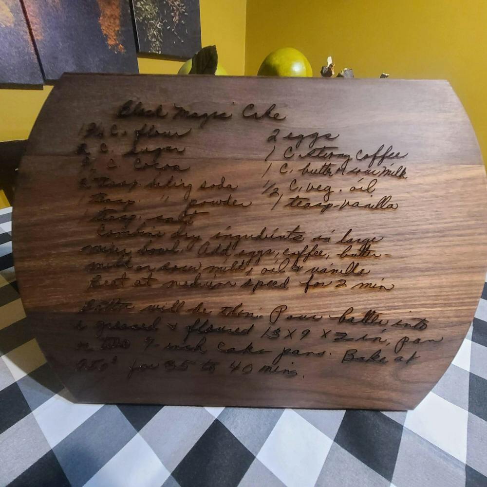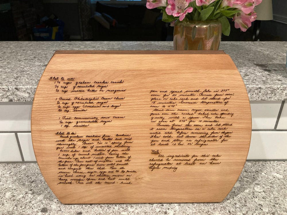 I ordered 3 cutting boards with my mother-in-law’s recipe (in her handwriting) as Christmas gifts. They turned out absolutely fabulous!! I can’t wait for Christmas to get here so I can see the looks on everyone’s faces! Thank you so much!!