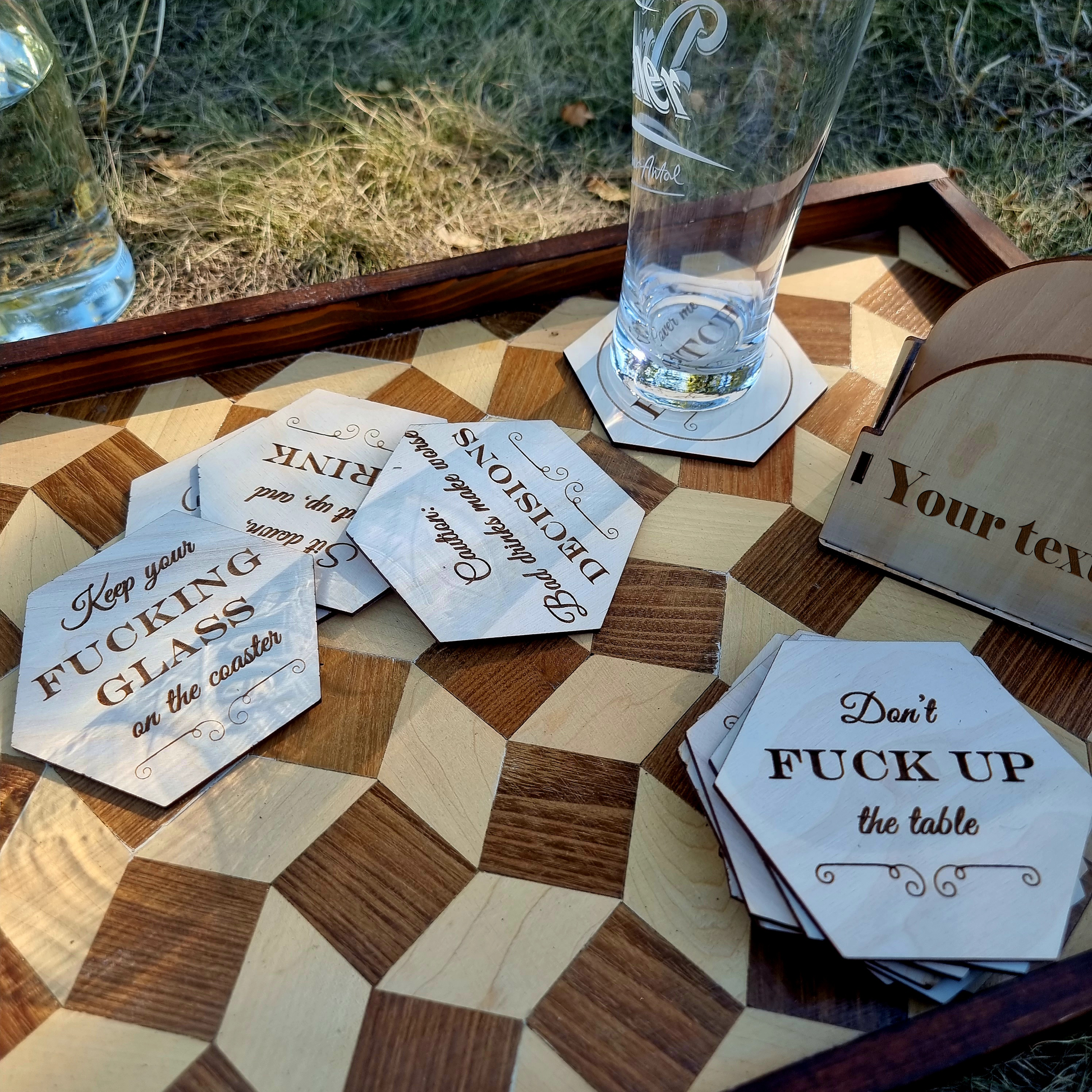 ✨ Add style, laughter, and protection to your table with these funny engraved wooden coasters!
