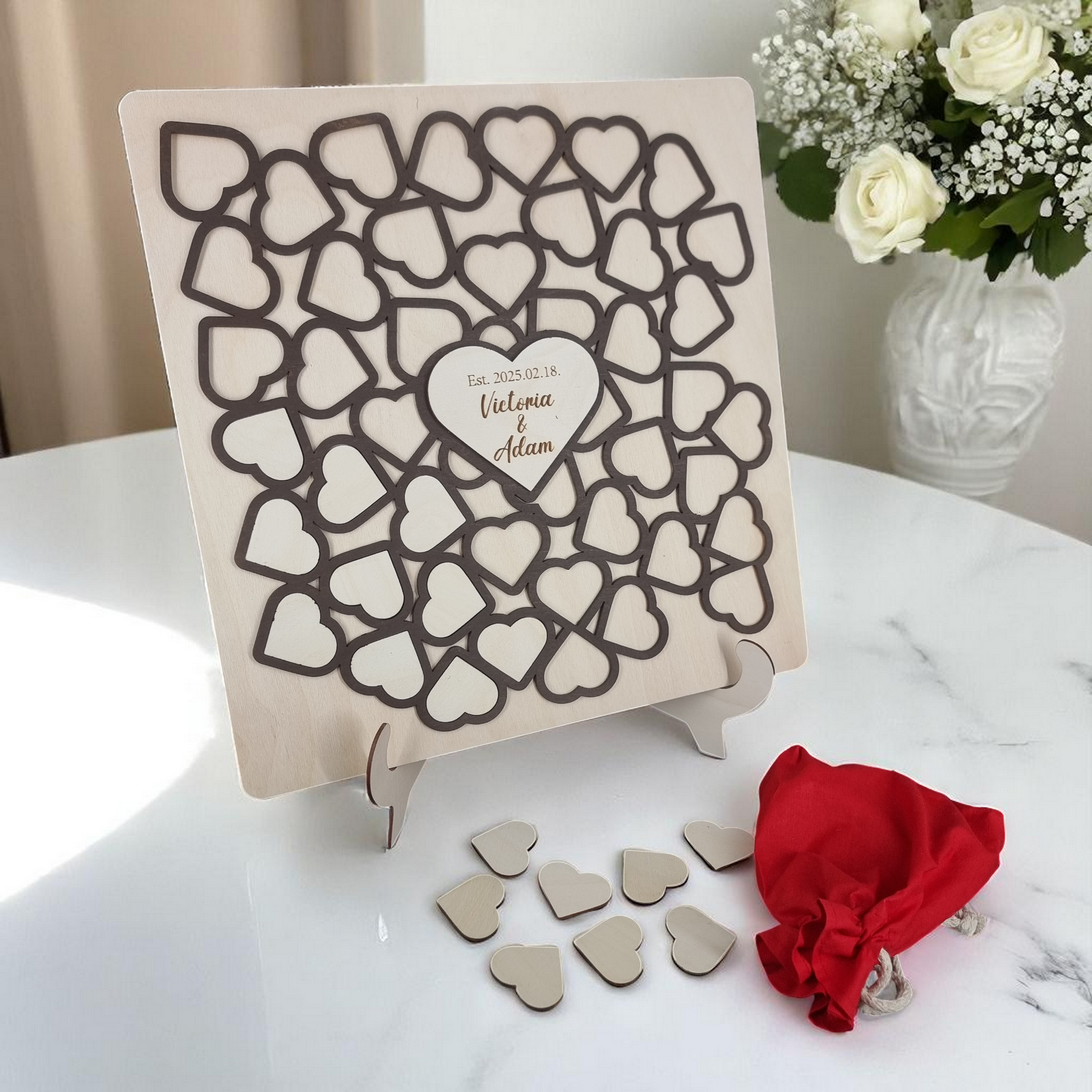 Instead of a traditional book, guests sign small wooden hearts and drop them into this charming frame, creating a heartfelt keepsake you’ll treasure forever.